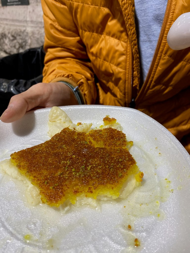 Habibah Sweets (right). Get in line for kunafah – a cheese-based pastry with a crispy shell, soaked in syrup and topped with pistachios. Even though a small order of it can be shared by two people, you’ll want your own. This will set you back a measly 0.35 JD (~50 cents USD) per order.